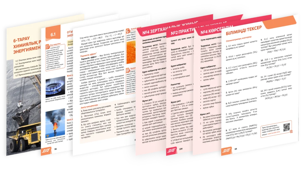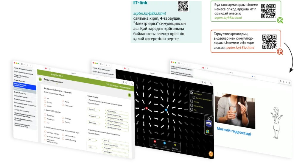 Тақырыпқа сәйкес симмуляторлар, видеолар және интерактивті тапсырмалар QR-код және сілтеме арқылы қолжетімді.